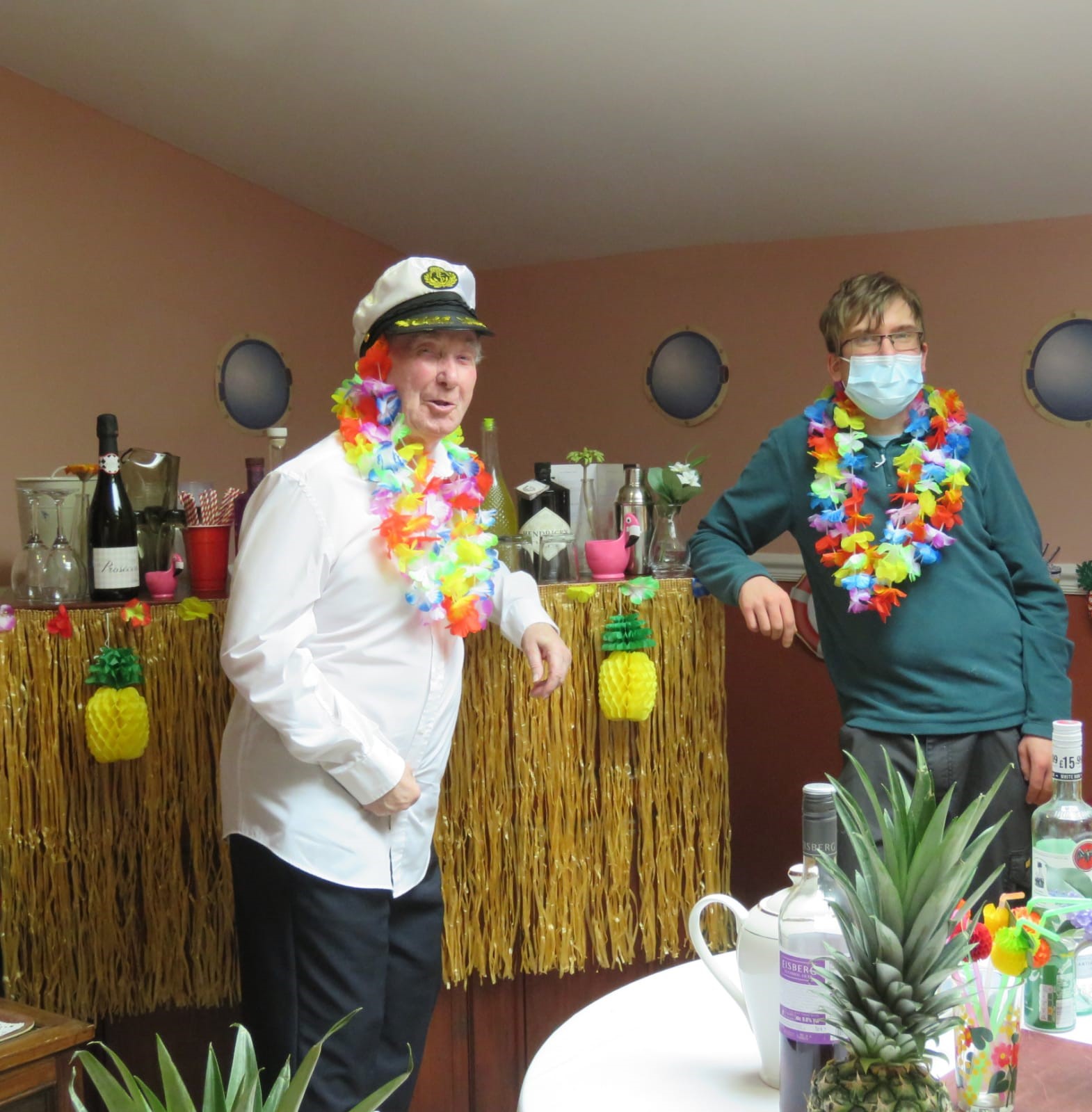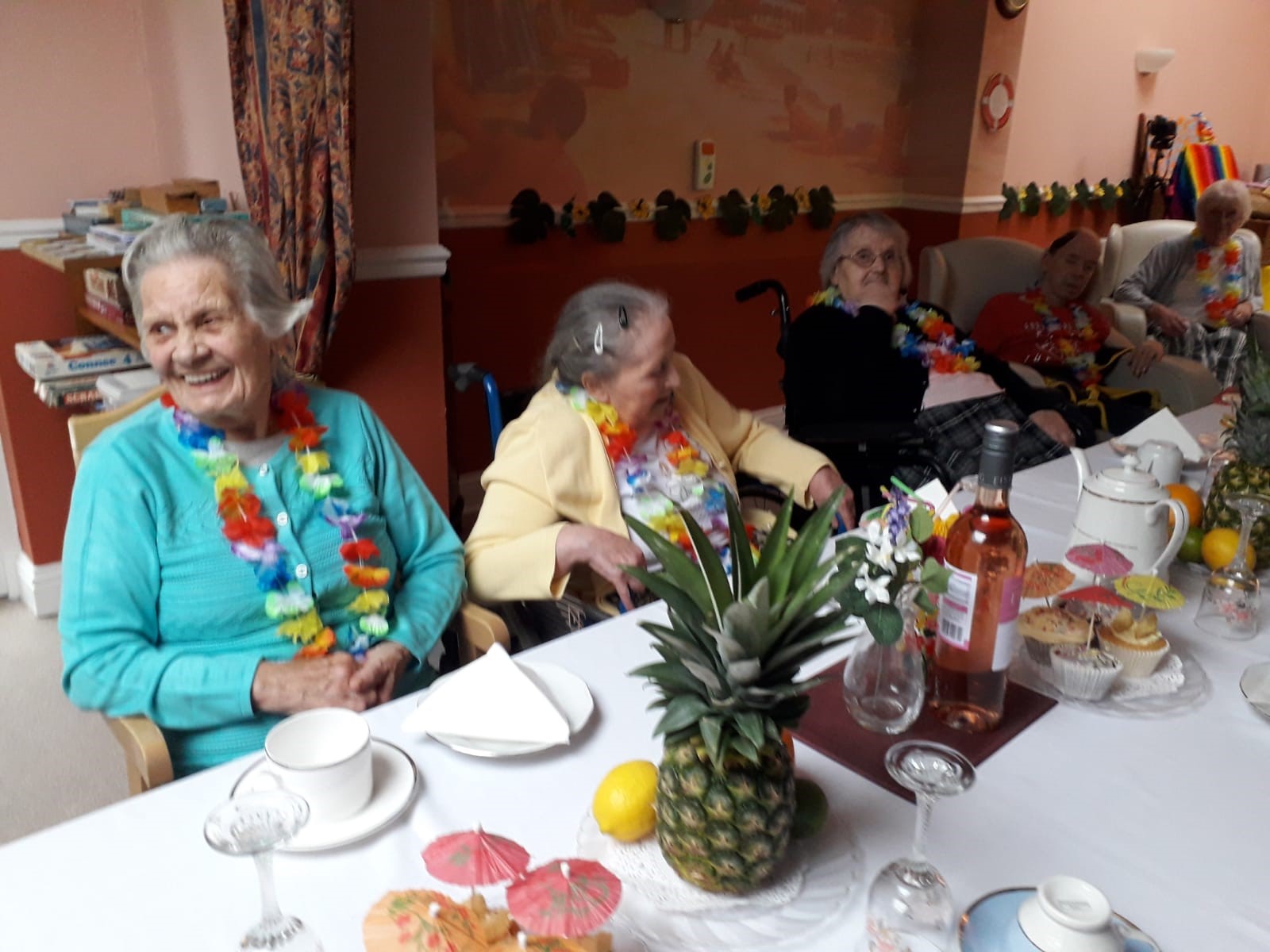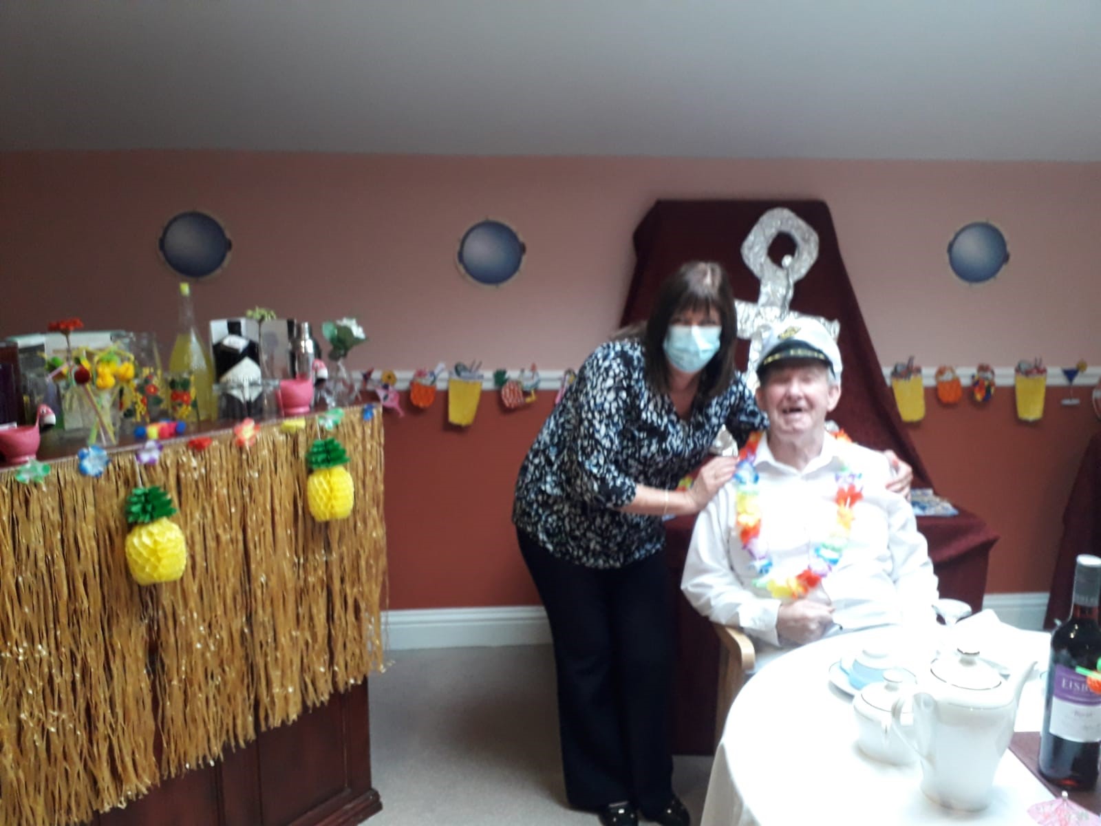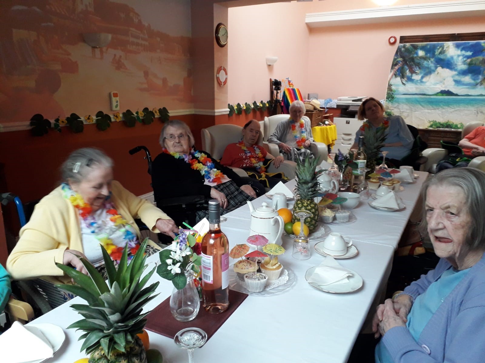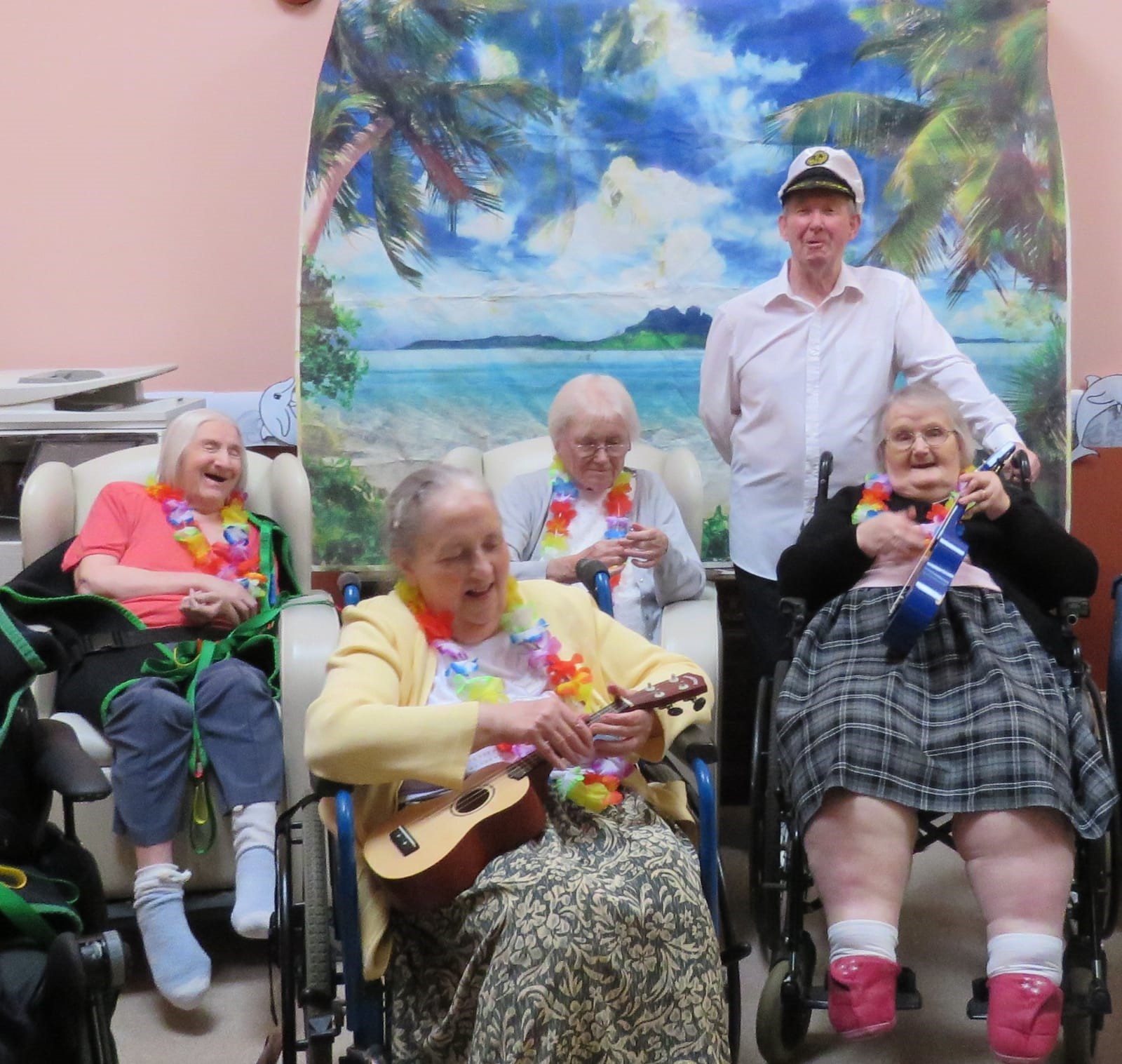 The dining room was set up for an afternoon photoshoot and residents had lots of giggles dressing up.  And to finish our holiday we enjoyed an afternoon tea, cake and wine session with Captain Bill and listened to Glynis’s stories from when she had visited the island when celebrating her 40th birthday.  She told us that she had visited Honolulu and Pearl Harbour and that it was amazing.