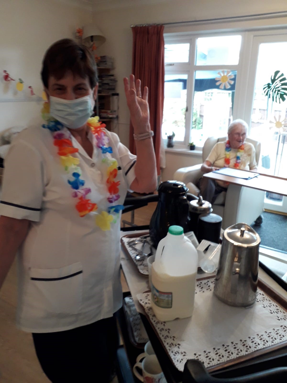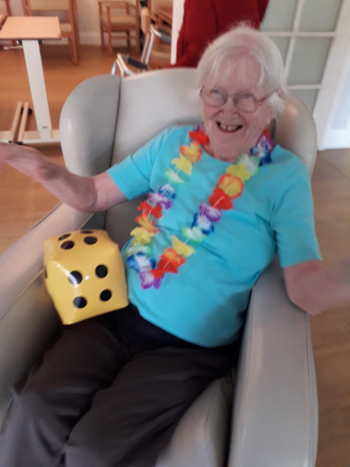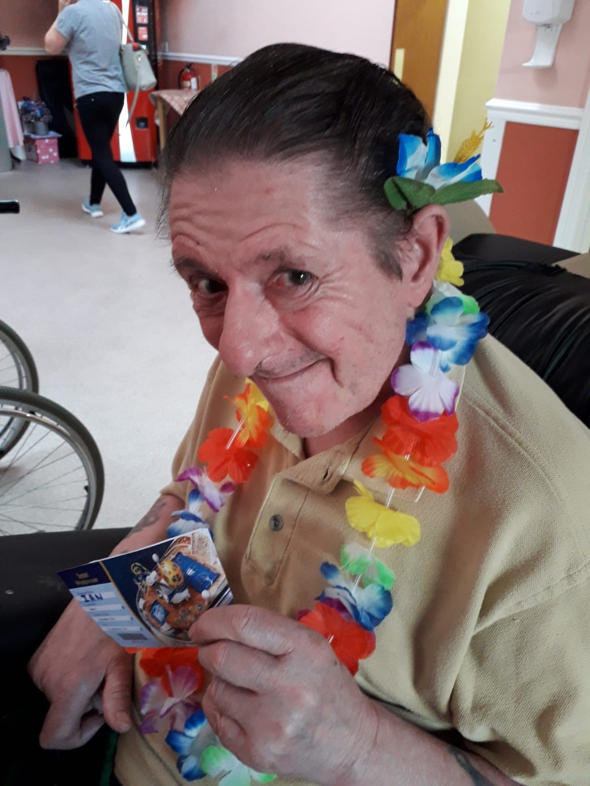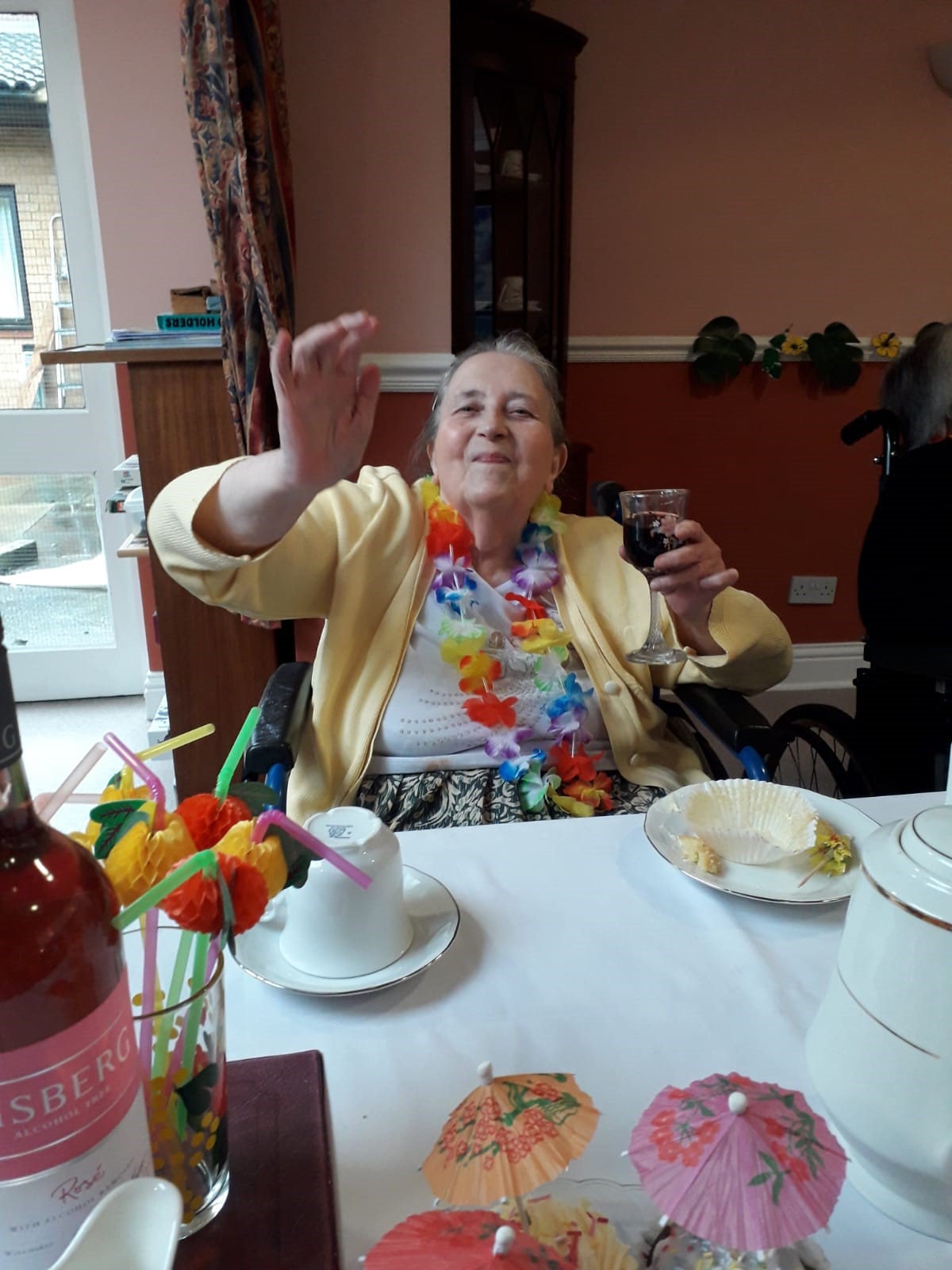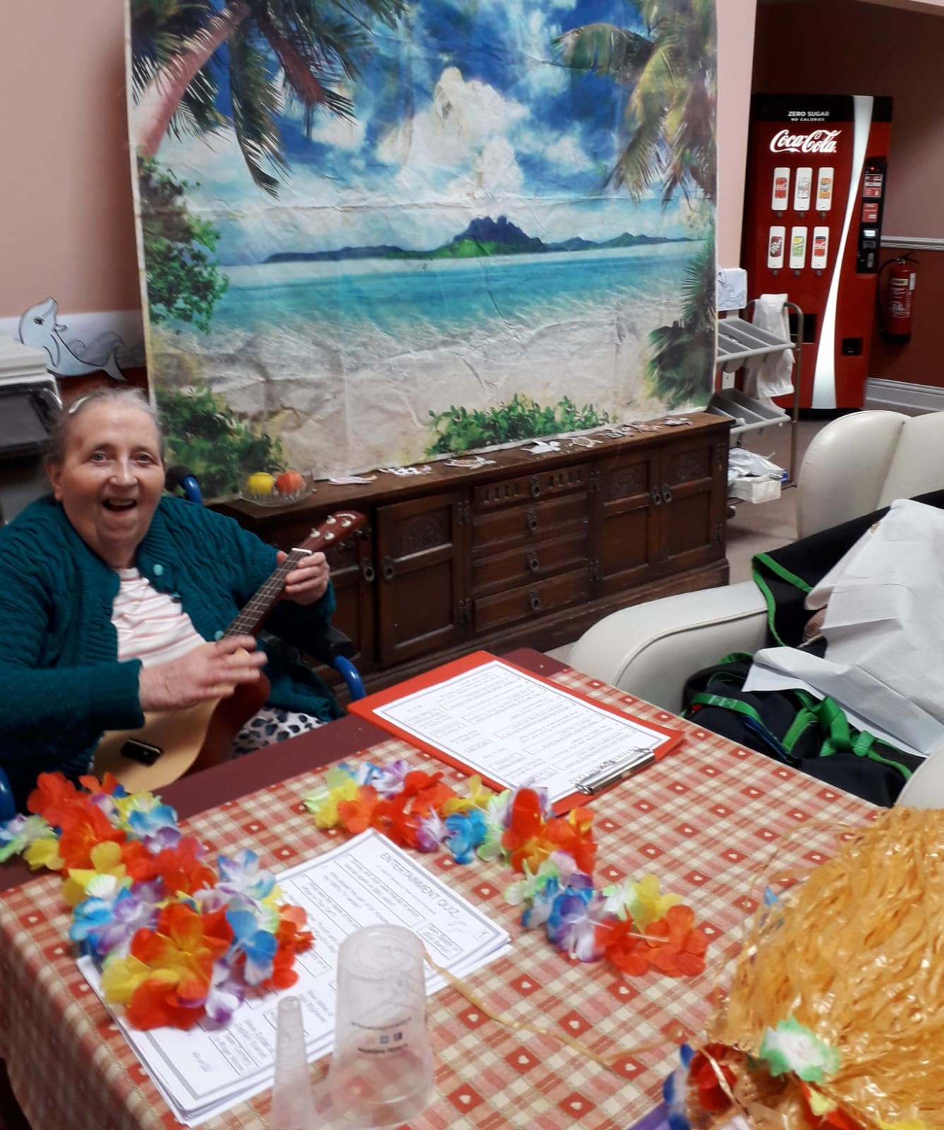 The dining room was set up for an afternoon photoshoot and residents had lots of giggles dressing up.  And to finish our holiday we enjoyed an afternoon tea, cake and wine session with Captain Bill and listened to Glynis’s stories from when she had visited the island when celebrating her 40th birthday.  She told us that she had visited Honolulu and Pearl Harbour and that it was amazing.
