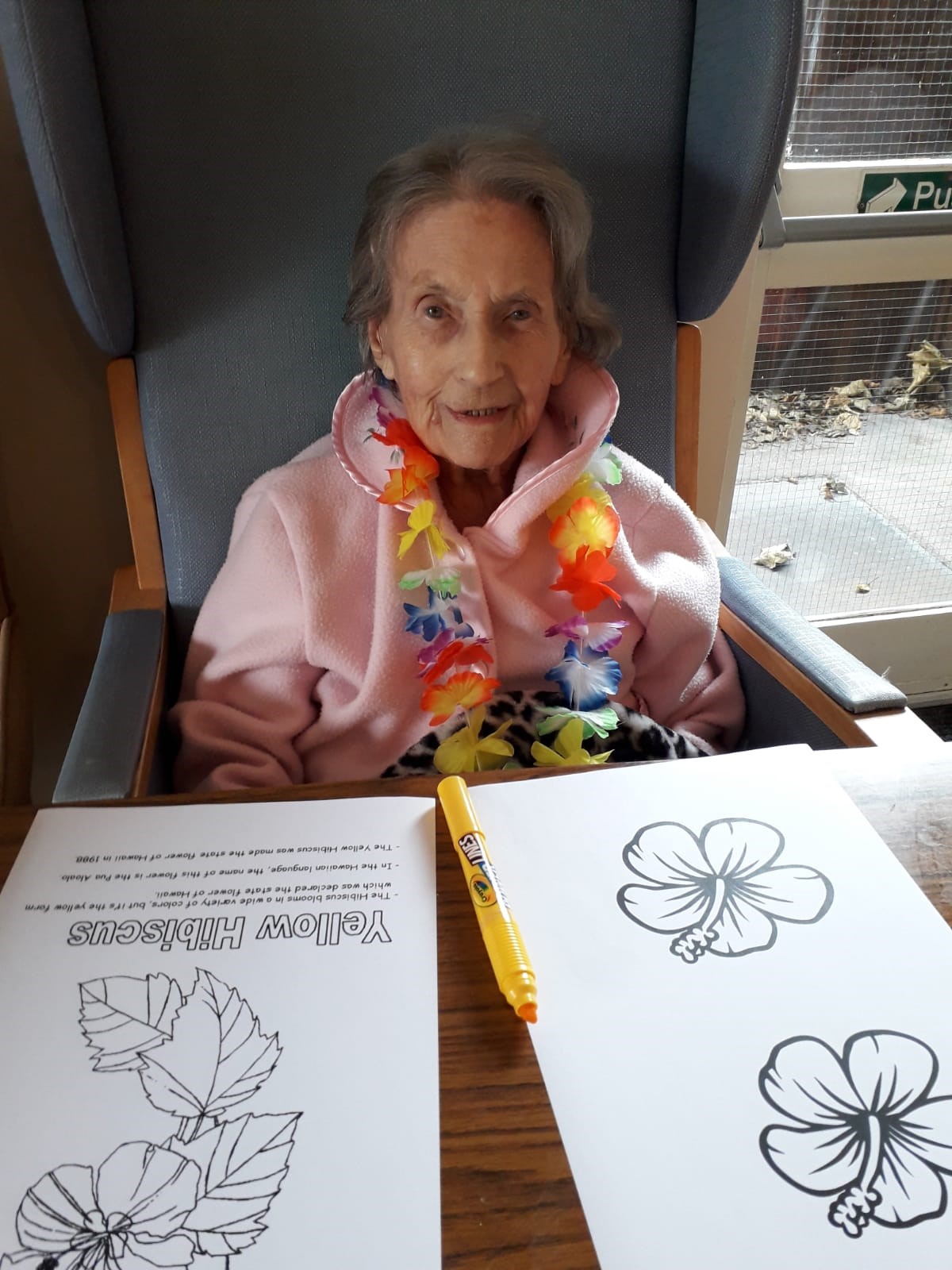 During arts and craft sessions we learnt about the history of the Hawaiian islands, the turtles on Laniakea beach and the native hibiscus flowers. Residents created pictures of turtles, flowers, palm leaves and dolphins for our displays.  We learnt that the Hawaiian ‘lei’, garland, which is presented to all on arrival or leaving the islands, is a symbol of affection.